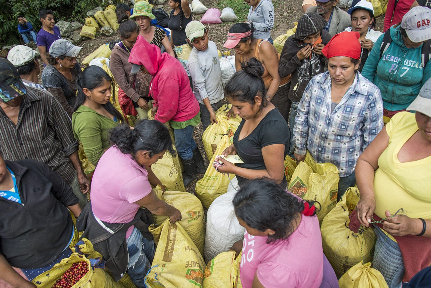 Foto 4 onderaan: Vrouwen leveren de koffievruchten in die ze hebben geplukt. De oogst van één dag levert 4 tot 7 dollar op.