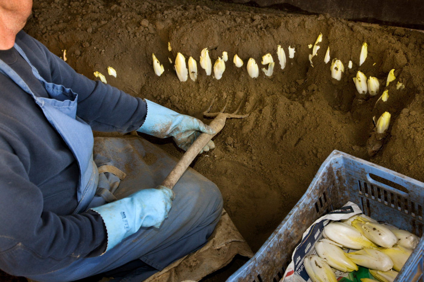 “Het begint in april/mei met het zaaien van het zaad op het veld, waarna er vanaf september gerooid wordt. Dat is een periode waarin je al behoorlijk wat werk moet verzetten. Witloof is immers een traag groeiende plant, waardoor je heel vaak onkruid moet weghalen tussenin. En voor de komst van precieze zaaimachines, gebeurde ook het zogenaamde op één zetten (het aantal plantjes uitdunnen en op de juiste afstand zetten) volledig handmatig. Vervolgens begint de bewaarfase, waarbij de wortels twee weken in de koude worden gezet om ze even in winterslaap – beter bekend als de vernalisatie die nodig is om de krop later in het donker te doen groeien – te brengen. Pas dan begint de echte forcerie, waarbij de wortels met aarde worden bedekt. Meestal gebeurt dat in een kuil in een schuur, wat maakt dat je dat niet alleen met de hand moet doen, maar je ook nog eens op je knieën moet zitten. Daarna hangt het af van het weer hoelang het duurt voor je een witloofkrop krijgt, die je op het einde met de hand kunt rooien – ook wel langen genoemd."