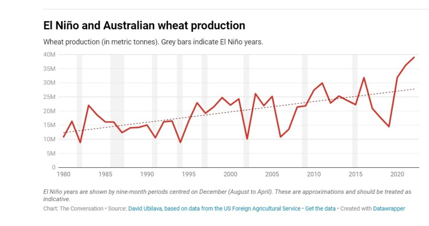 Een goed voorbeeld is tarwe. De volgende grafiek laat zien hoe El Niño de Australische tarweproductie sinds 1980 heeft beïnvloed. In zes van de negen El Niño-gebeurtenissen van ten minste gemiddelde sterkte is de productie aanzienlijk gedaald - in vier gevallen ten minste dertig procent onder de "trendlijn" (die het langetermijngemiddelde weergeeft). Australië is een van de drie grootste tarwe-exporteurs ter wereld en is goed voor ongeveer dertien procent van de wereldwijde export. De Australische productie heeft dus invloed op de wereldwijde tarweprijzen.