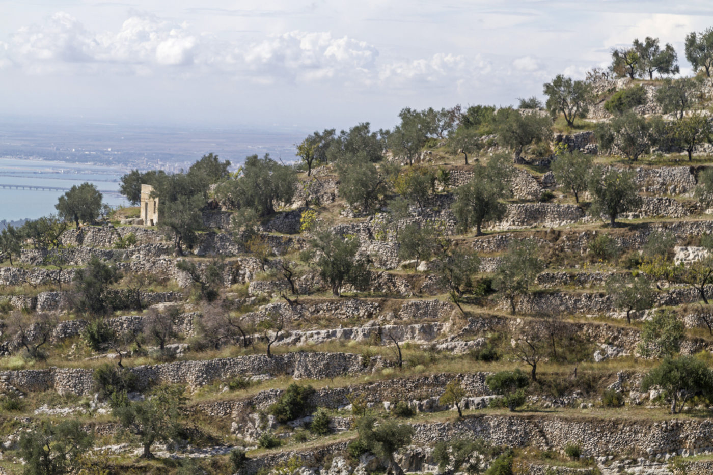 De aanleg van bankterrassen is een manier om bodemerosie bij olijfboomgaarden te voorkomen.