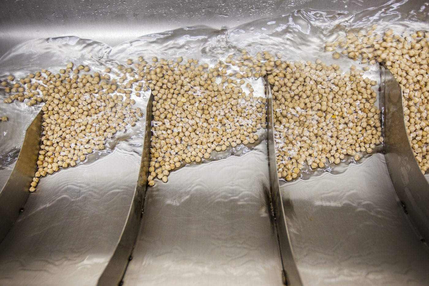In de fabriek gaan de kikkererwten eerst naar de ‘wasmachine’. Die schudt eerst de steentjes en takjes eruit. Vervolgens wast de machine de kikkererwten met water. Ze blijven een aantal uren onder water, totdat ze opgezwollen zijn.