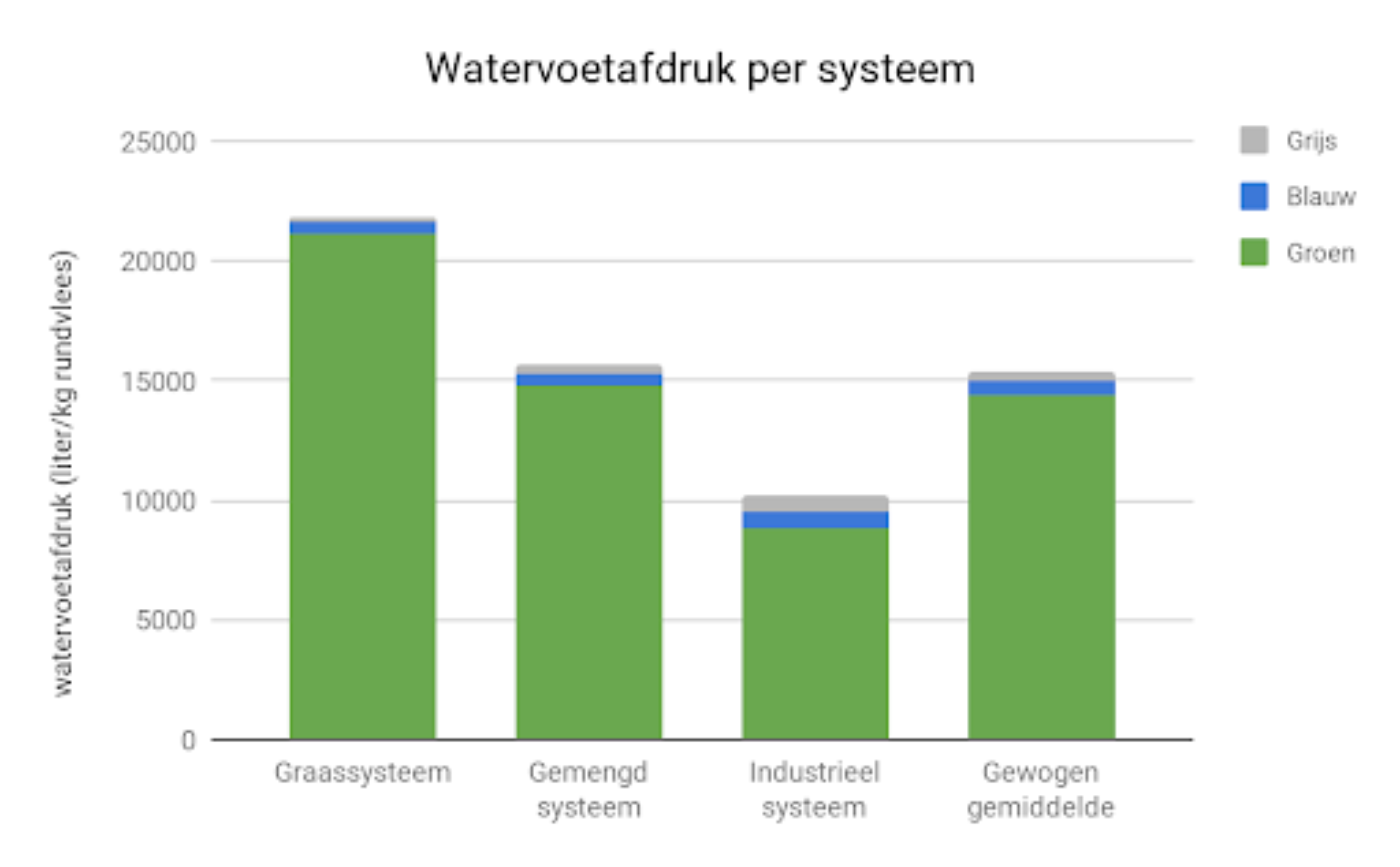 Deze grafiek laat zien dat industriële systemen in totaal minder water verbruiken dan de graassystemen. Wel is het zo dat een groter deel van het waterverbruik in industriële systemen afkomstig is van blauw (grond- en oppervlaktewater) en grijs water (vervuild water), wat waterschaarste en watervervuiling met zich meebrengt. Vanuit dat standpunt zijn graassystemen dus te verkiezen boven industriële systemen.